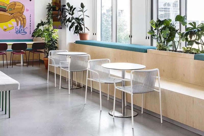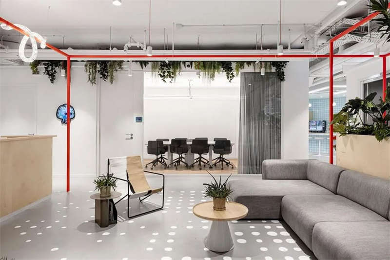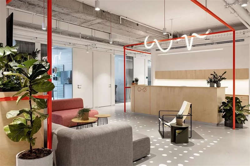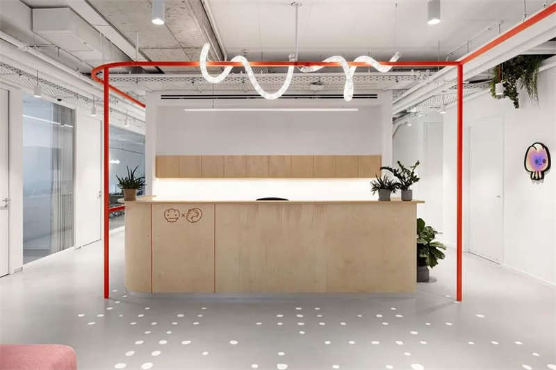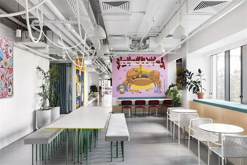 本案的設(shè)計出發(fā)點旨在創(chuàng)建一個獨特的空間體驗。在以混凝土、裸露的白色天花樓板、綠色植物、天然木材和白色金屬構(gòu)筑的中性調(diào)空間背景中,注入跳躍的色彩和卡通圖形設(shè)計去展現(xiàn)其設(shè)計理念。