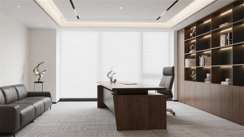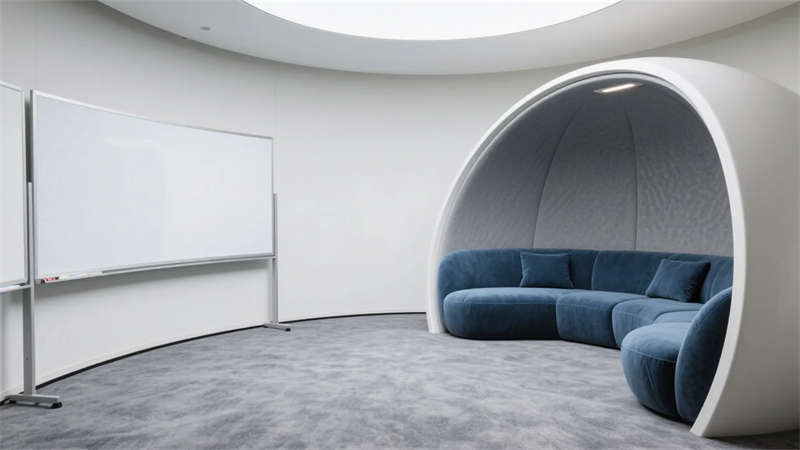 核心區(qū)域聚焦功能與美學(xué)的平衡:前臺木格柵墻以線性燈光延展空間縱深感;開放式工位區(qū)通過綠植與幾何畫作注入生機(jī);獨(dú)立辦公室運(yùn)用胡桃木與皮質(zhì)元素提升質(zhì)感,整墻書架成為智慧沉淀的象征。過渡空間被賦予多重價值——走廊生態(tài)墻引入自然呼吸,蛋形討論艙激發(fā)即興靈感,階梯圖書館則營造沉思角落。