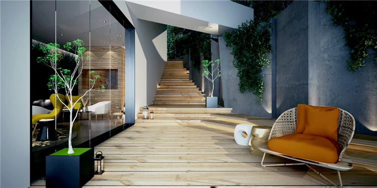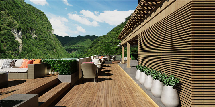 本案度假酒店設(shè)計(jì)依山傍水,設(shè)計(jì)師在規(guī)劃時(shí),充分考慮到自然環(huán)境帶給酒店的附加值。設(shè)計(jì)方案時(shí),設(shè)計(jì)師就將部分功能區(qū)規(guī)劃到室外露天場(chǎng)地,當(dāng)然在室內(nèi)設(shè)計(jì)中也充分利用了自然采光的設(shè)計(jì)手法,讓整個(gè)度假酒店與自然環(huán)境融為一體。