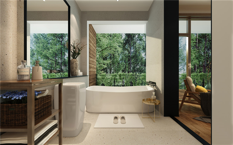 整個(gè)度假酒店設(shè)計(jì)的材料均以原木為主,以此來(lái)表達(dá)一種親近生態(tài)的質(zhì)感。再配以民宿建筑風(fēng)格的設(shè)計(jì)方式,不僅凸顯了度假酒店的“材質(zhì)”,同時(shí)也有一種返璞歸真的歸屬感。