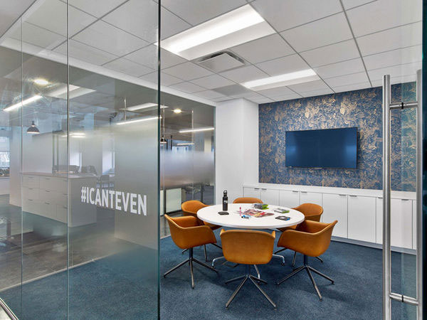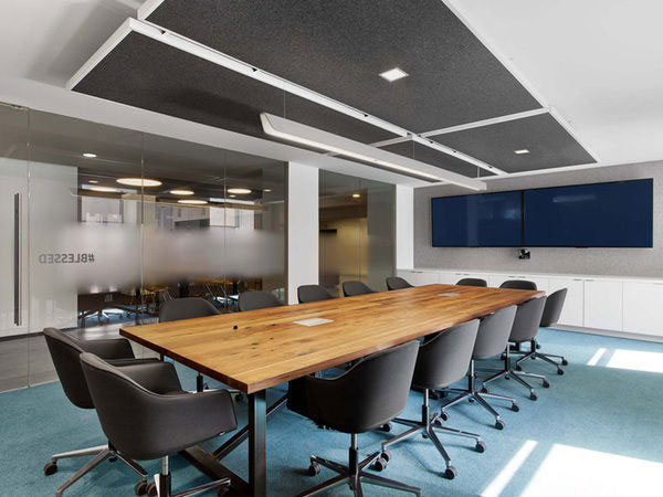 清朗凝練的空間更多了一份雍容典雅的都市氣質(zhì),依舊以藍色標志色為裝飾主調(diào),只是這次的藍色更暗雅、更富于細膩的變化。極富質(zhì)感的白蠟木材質(zhì)與黑色碳鋼構(gòu)件制作的家具,呈現(xiàn)出特有的都市氣質(zhì)。閉合的洽談室和會議室大多聚集于空間的內(nèi)部,以盡可能留出沿窗的空間令視線不被遮擋。連續(xù)而開敞的玻璃窗,讓室外城市美景盡收眼底,心情也變得豁然開朗。