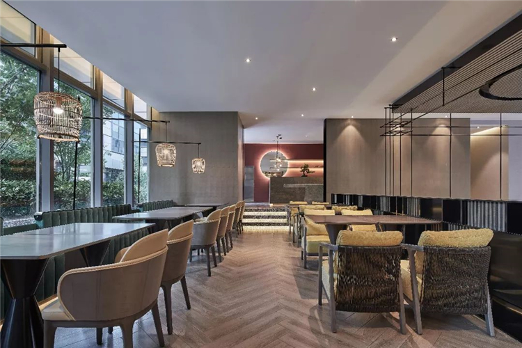 傳統(tǒng)與現(xiàn)代的融合變通,通過(guò)汲取傳統(tǒng)徽派的木構(gòu)斗拱、瓦片、留白的山墻和民居的水墨意境,運(yùn)用新的材料進(jìn)行演繹,如水磨石的地面、背景墻藝術(shù)圖案結(jié)合金屬網(wǎng)、半透的夾絲玻璃、黑色的金屬構(gòu)建.以寫(xiě)意的方式提取徽州的意境,延續(xù)徽派建筑的黑白兩色,再點(diǎn)以中國(guó)傳統(tǒng)色系軟裝搭配,表達(dá)了設(shè)計(jì)對(duì)傳統(tǒng)的回歸和未來(lái)的展望.