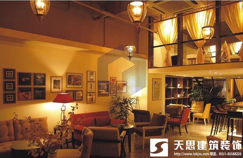 咖啡館的頂面處理就要根據(jù)總體空間安排是否吊頂。如果吊頂?shù)脑?huà),一般采用石膏板再以乳膠漆飾面,頂上的乳膠漆盡量用純白色的,便于把進(jìn)入房間的光線(xiàn)很好地反射下來(lái)。