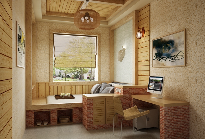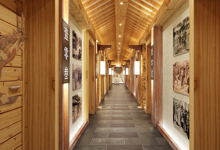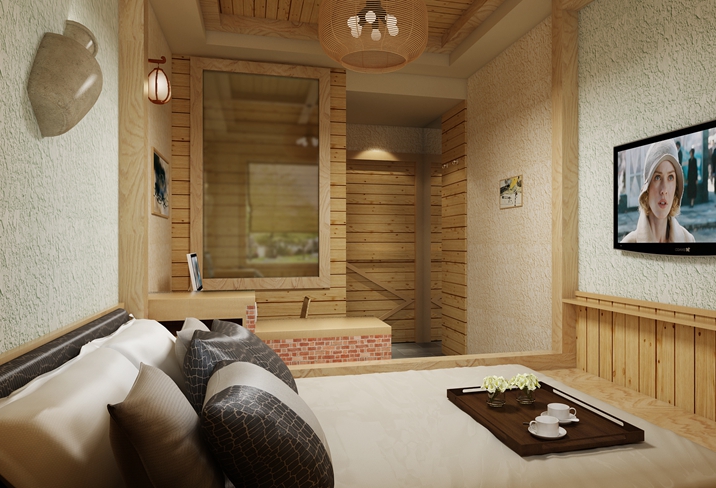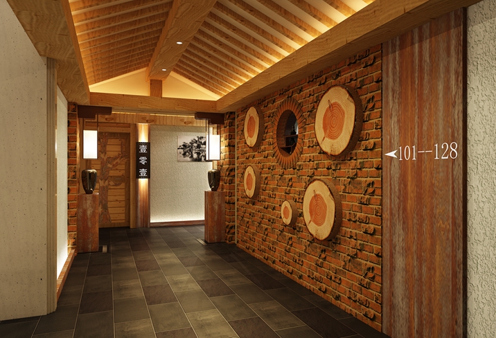 該項(xiàng)目主要是以近代的炕及木制品為元素,房間的床、電腦桌、電視柜、床頭柜都是用紅磚清水墻砌的,墻面是白色的彈涂顆粒飽滿十分的美觀,頂面局部采用的是桑拿板吊頂,其余部分為石膏板吊頂噴彈涂,加上特色的壁燈,讓人置身其中有種回到中國(guó)近代的感覺(jué)。