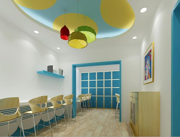 前臺大廳的設計:陽光透過大門射入室內,讓人感覺到溫馨與溫暖,設計師希望陽光可以無處不在,讓孩子在這樣的環(huán)境下可以健康、快樂的成長,在其中設計師采用了陽光、色彩之間的相互交融,設計師希望展現(xiàn)在孩子面前的是一個五顏六色的世界。