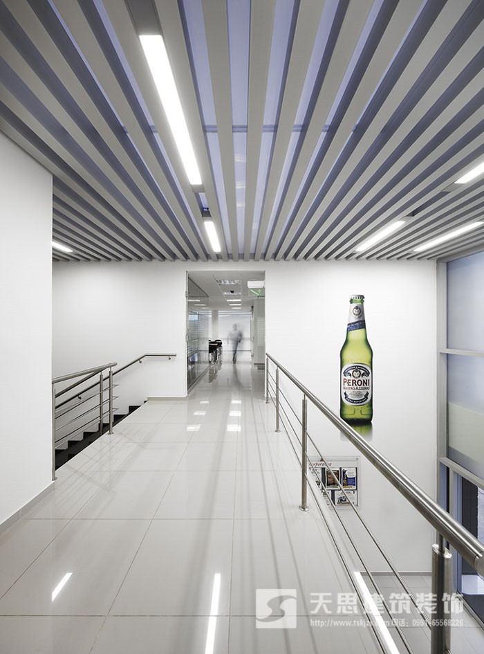 過道好似云梯,潔白的空間給人一種別樣的感覺,讓空間不在單調(diào),大大的啤酒瓶鑲嵌在空間的白墻上,既做為點(diǎn)綴,同時(shí)也作為企業(yè)的品牌宣傳。