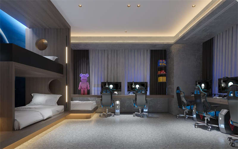 電競酒店不同于網(wǎng)吧的一點就是環(huán)境舒適,安靜不嘈雜,體感更舒適,由于空間隱蔽,隱私性和自由度更高一些,這些的要求需要在室內(nèi)設(shè)計的環(huán)節(jié)中有所呈現(xiàn)。