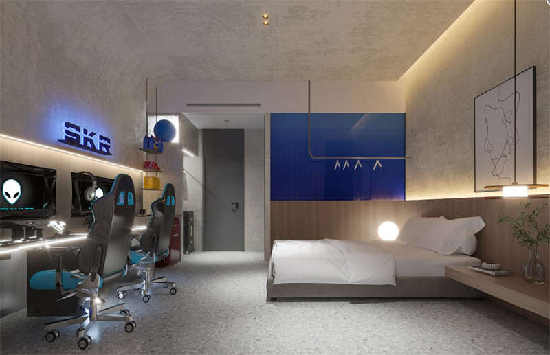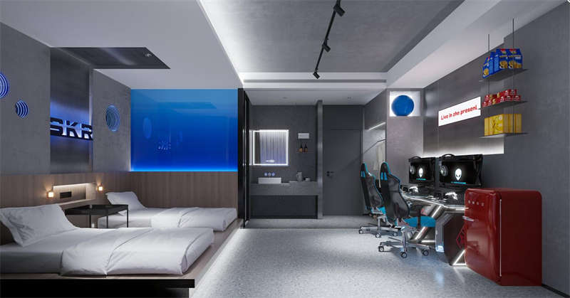 相信很多電競酒店投資人在籌備設(shè)計時,都會思索如何將電競元素和入住體驗完美融合。一方面需考慮符合電競愛好者審美,增加潮酷元素;另一方面則需考慮睡眠質(zhì)量,減少炫目元素。