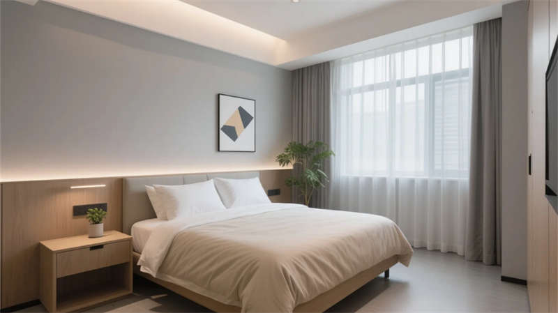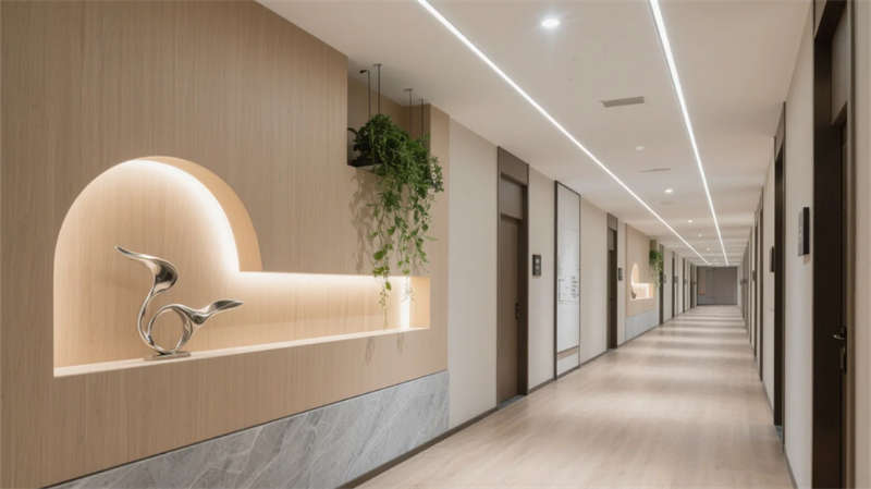 酒店以現(xiàn)代簡約美學貫穿始終,走廊作為串聯(lián)各區(qū)域的紐帶,延續(xù)了整體的設計語言。弧形壁龕與懸浮天花板的線性燈光,柔和地引導動線,淺木飾面與石材的碰撞在低調中彰顯質感。壁龕內的藝術擺件與垂墜綠植,將自然氣息融入過渡空間,打破傳統(tǒng)走廊的單調感。
