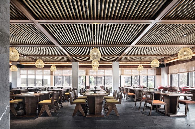 九華當?shù)囟嘀衲荆O計就地取材,空間中運用較多原木家具和竹制吊燈,及一些土陶制品,表達對本土文化的致敬和延續(xù),凈土在禪,于自然質樸之中,斂去了浮華氣息。