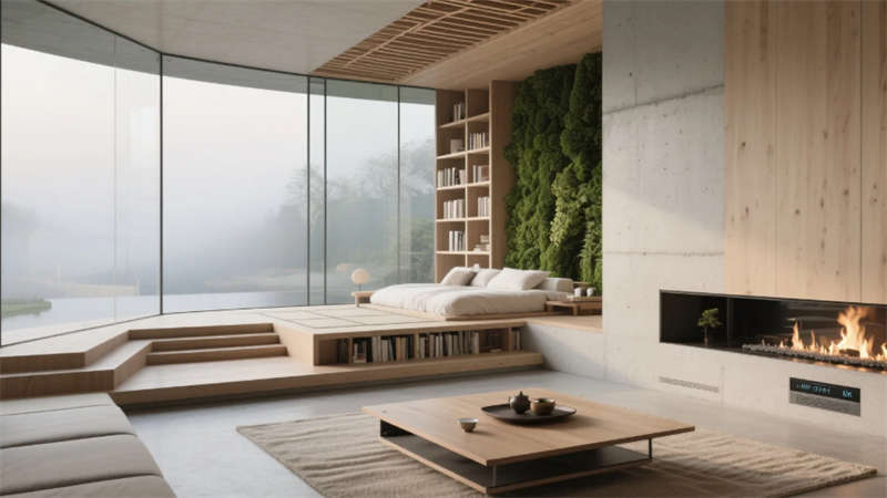 客房以極簡的智慧回應(yīng)棲居本質(zhì)。榻榻米地臺消弭床與地面的界限,270°環(huán)景霧化玻璃輕觸即透,仿生綠植在智能光影中呼吸生長,隱藏式投影幕布落下時,星空與林海皆成私享背景。階梯書吧的垂直綠植墻下,模塊化沙發(fā)隨需求自由組合,全息粒子在空氣中勾勒出流動的藝術(shù),而巖板中島餐廳里,藤編座椅與吊燈矩陣的光暈交織,智能調(diào)光天窗讓每一餐都浸染著天光的溫度。