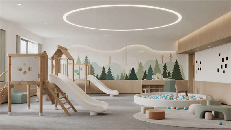 這座親子民宿以現(xiàn)代簡(jiǎn)約美學(xué)為靈魂,將自然元素與童趣設(shè)計(jì)無(wú)縫銜接。空間摒棄繁復(fù)裝飾,選用淺木、純白與低飽和色彩鋪陳,弧形線條與柔和光影交織,營(yíng)造出寧?kù)o而溫暖的氛圍。從大堂的嵌入式動(dòng)物燈箱到套房的樹(shù)屋床鋪,每一處細(xì)節(jié)都暗藏親子互動(dòng)巧思,安全圓角家具與軟包地臺(tái)呵護(hù)孩童探索的每一步。