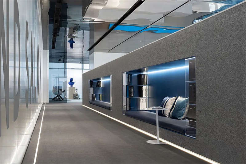 設(shè)計師在灰調(diào)的空間中,注入純凈的克萊因藍,高飽和度的單純色彩具有神奇的魔力,讓人們在強烈的視覺沖擊下迷失感官,與室外的海天融通一體,達致沒有感官桎梏的心靈自由;灰色則讓空間保有充裕的從容,以及留白的呼吸感。以此實踐在物質(zhì)之上,具有純粹精神的空間情景。