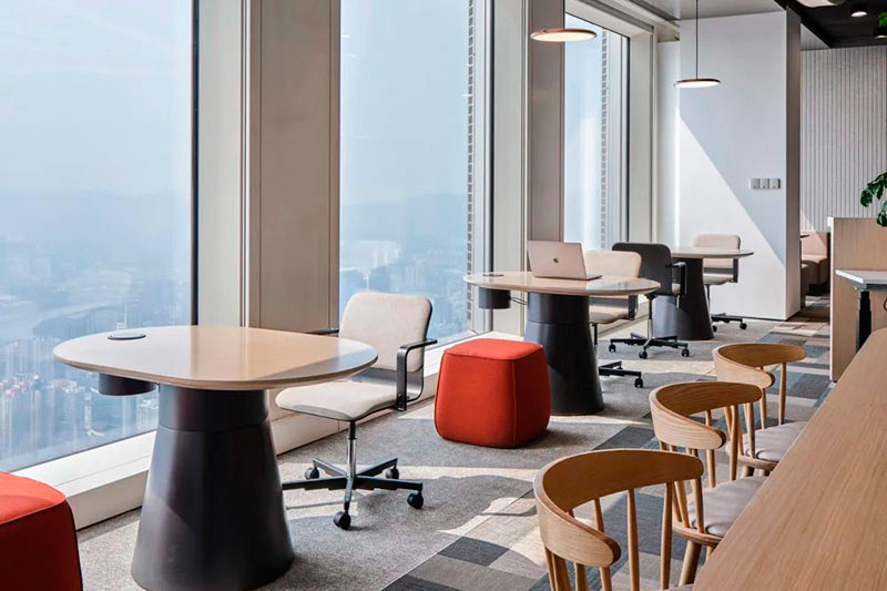 不同于投資公司的傳統(tǒng)形象,設(shè)計師以一個圓島吧臺和開敞的自由交流區(qū)作為前廳接待場所。大量的自然光涌入室內(nèi),明凈開闊。天花地面是圓轉(zhuǎn)流動的曲線造型,采用水磨石地面、金屬網(wǎng)天花、Bolon塑膠地毯等各種新環(huán)保材料,輔以色彩鮮麗的多功能家具組合、大型LED屏和隨處點(diǎn)綴的綠植,呈現(xiàn)出年輕、現(xiàn)代、科技而又充滿能量的生命氣息。