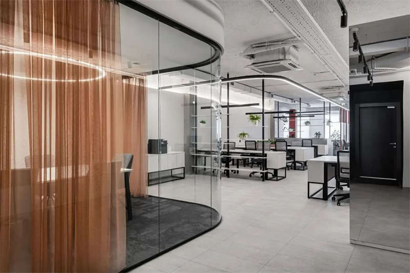 會議室的半圓形形狀類似于智能手機上的耳機。由透明的玻璃圍合的會議室即界定了空間,又帶來輕盈靈動的通透感,且玻璃自身無與倫比的光澤感也賦予空間時尚和未來的氣息。