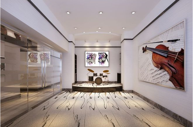 本次設(shè)計(jì)將現(xiàn)代元素和傳統(tǒng)元素結(jié)合在一起,以現(xiàn)代人的審美體驗(yàn)來(lái)打造一個(gè)個(gè)性化的音樂(lè)培訓(xùn)中心。以跳動(dòng)的音樂(lè)節(jié)奏旋律進(jìn)行抽象化,采用局部色彩點(diǎn)綴,對(duì)形式進(jìn)行創(chuàng)新,對(duì)材質(zhì)進(jìn)行重組,用線條和色彩來(lái)分割視覺(jué)比例,使用新型輕質(zhì)隔墻保證良好的隔音,簡(jiǎn)潔童趣的墻貼為整個(gè)空間增添了生機(jī)。