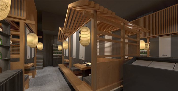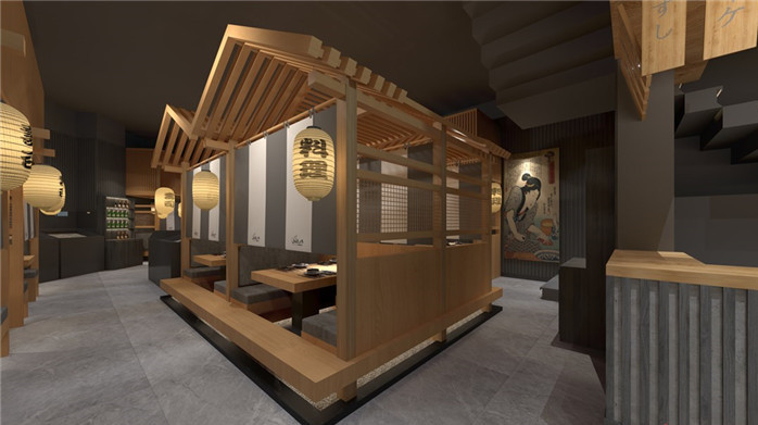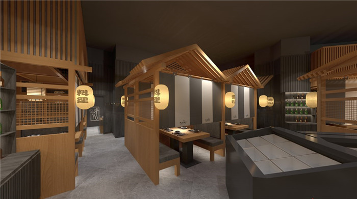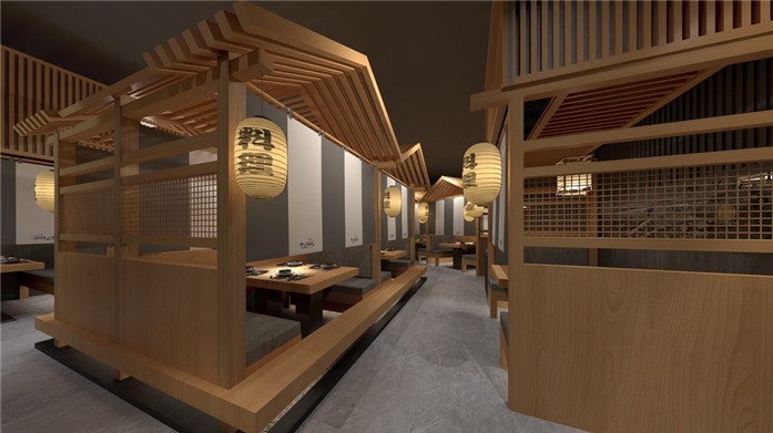 整體設(shè)計(jì)風(fēng)格上以日式精致私密性為主,每個(gè)餐臺(tái)都有獨(dú)立的隔斷進(jìn)行分割,這樣在整個(gè)空間中就會(huì)形成錯(cuò)落有致的空間布局,不僅美觀而且空間利用率高,同時(shí)保障了顧客就餐的私密性。