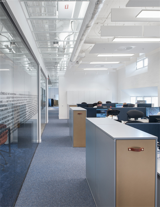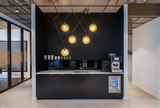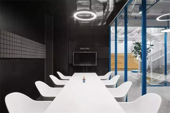 時尚與藝術(shù)并存的辦公室設(shè)計(jì)案例:整個空間設(shè)計(jì)手法簡約,原有建筑構(gòu)造和設(shè)備管線都展露無遺,色彩的巧妙構(gòu)筑讓這處極簡loft風(fēng)的辦公環(huán)境充滿了時尚的活力氛圍。墻面上充滿活力的圖案和一張乒乓球桌是視覺中的主角,而主入口就在這里。這里沒有傳統(tǒng)的接待臺,訪客進(jìn)入辦公室,可以為自己沖杯咖啡,然后進(jìn)入到內(nèi)部空間。入口處設(shè)有員工更衣室。辦公室的中央是一處大型演講廳,也是主要的活動場所。多功能演講廳配有看臺式階梯座、咖啡吧、屏幕和投影儀、講臺和所有其它必要的設(shè)備,即可以舉辦研討會、各種宣講,也是一處極為舒適的聚會場所??臻g內(nèi)的照明設(shè)計(jì)非常獨(dú)特,采用了網(wǎng)格狀的矩陣布局,將所有燈具串聯(lián)在一起,形成精致的美學(xué)效果。整個空間形成一個明亮的背景,襯托出有趣的設(shè)計(jì)細(xì)節(jié)和墻面圖形設(shè)計(jì)。