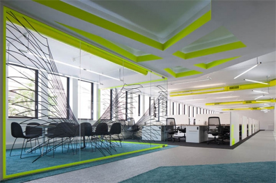 時尚辦公室裝修設(shè)計(jì):以白色為空間主調(diào),加入充滿活力的顏色,如霓虹黃色頂面線槽、以及柔軟的綠松石色地毯點(diǎn)綴在灰與黑色地毯間。裸露的頂面管道噴涂以同樣的黃色;每一組工位都以醒目的霓虹黃色字母加以標(biāo)識??臻g的其它色彩以中性色加以調(diào)和,以免跳躍的霓虹黃色太過強(qiáng)烈刺激。會議室的玻璃隔墻,上面繪制了一系列的天使(Angel)翅膀圖形,為密集的辦公區(qū)增添了豐富的視覺效果。休閑區(qū)與辦公區(qū)之間一道纏繞于金屬管道之間的紅色Z字型隔屏,活躍了空間色彩。設(shè)計(jì)師以清新簡約的空間配色,打造了一個開敞明亮、且獨(dú)具個性特色的時尚辦公室。