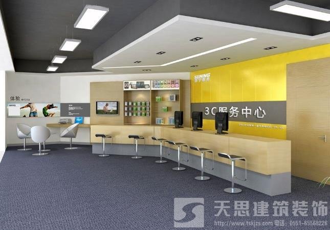 電腦售后維修店面設(shè)計(jì)選擇自然素雅,室內(nèi)左右兩側(cè)可以擺放展示架,玻璃櫥窗搭配更加明朗自然,擺放很多電腦的配件,方便挑選,維修的時(shí)候也更加輕松便利。前方的服務(wù)臺(tái)要設(shè)計(jì)的寬敞,這樣工作人員才能更好的在這里為客戶服務(wù)。室內(nèi)還可以配置茶幾和座椅,閑暇的時(shí)候在這里聊天茗茶,感受輕松自在的體驗(yàn)。