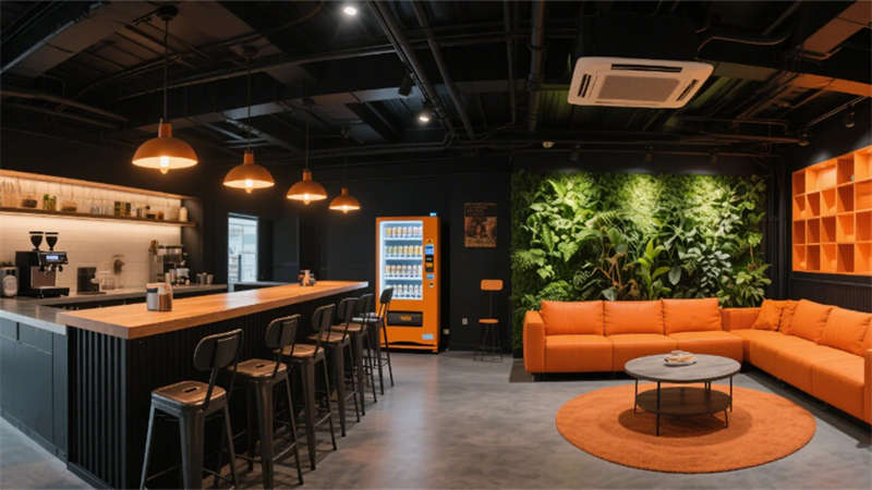 人性化細(xì)節(jié)貫穿各區(qū)域:電梯廳導(dǎo)向系統(tǒng)與隱藏式消防設(shè)施實(shí)現(xiàn)功能隱形化,員工休息區(qū)混搭工業(yè)風(fēng)吧臺(tái)與暖光沙發(fā),搭配咖啡機(jī)與綠植墻釋放壓力。設(shè)計(jì)同步植入環(huán)保理念,采用低能耗照明系統(tǒng)、空氣監(jiān)測(cè)模塊及可回收建材,構(gòu)建健康可持續(xù)的辦公生態(tài),傳遞企業(yè)面向未來的品牌價(jià)值觀。