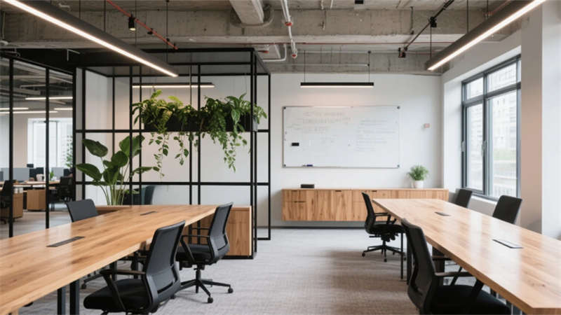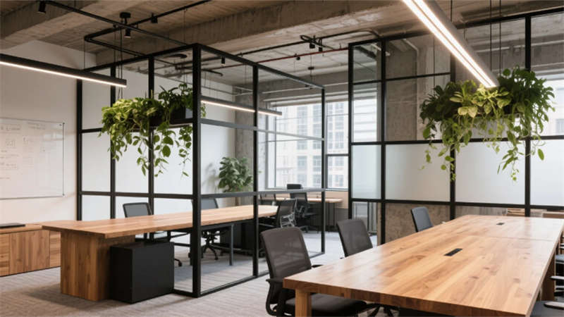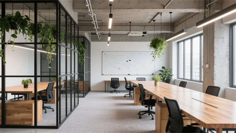 該辦公空間以暖調(diào)輕工業(yè)風(fēng)為靈魂,將冷峻的金屬骨架與溫潤(rùn)的竹木元素交織,在微水泥的灰調(diào)基底上鋪陳出理性與感性的平衡。開(kāi)放辦公區(qū)借落地窗引光入室,綠植墻與軌道燈串聯(lián)起流動(dòng)的協(xié)作場(chǎng)景;獨(dú)立專(zhuān)注艙與水吧區(qū)形成動(dòng)靜分區(qū),滿(mǎn)足深度思考與即時(shí)社交的雙重需求。