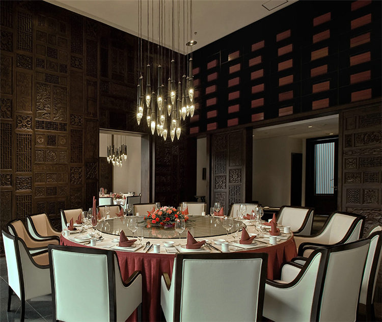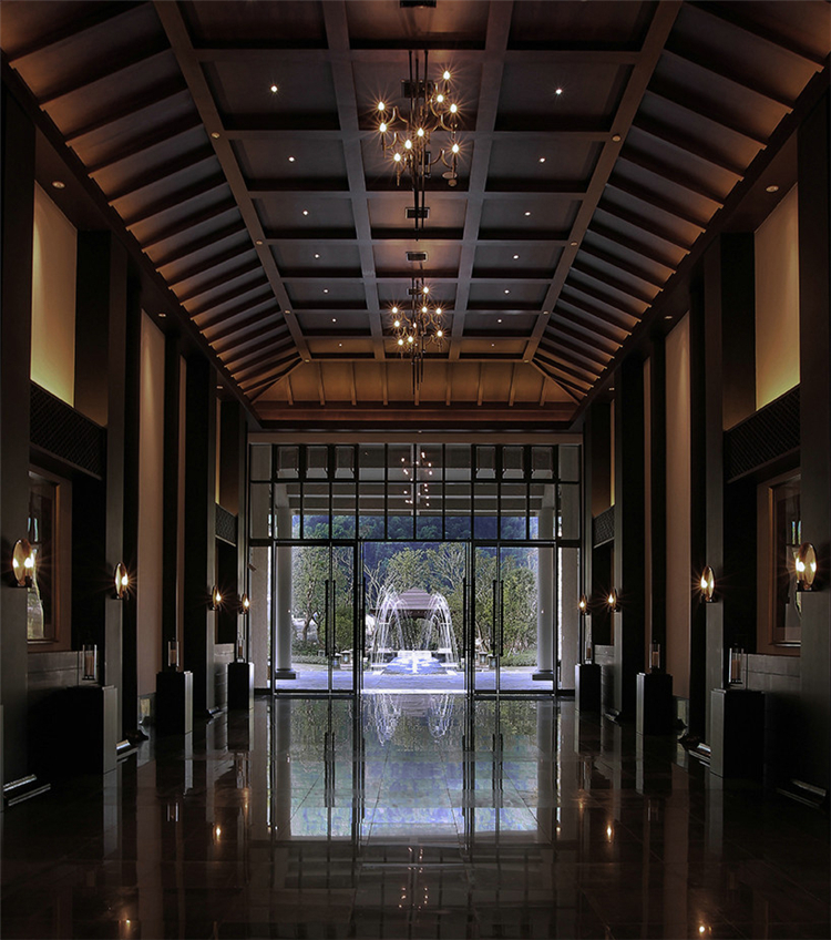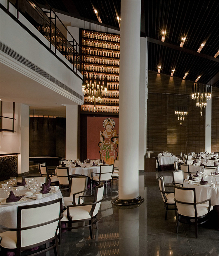 穿過(guò)悠長(zhǎng)的走道,在灰白色空間配合溫暖沉著木色格子窗棱,讓客人逐步感受一種優(yōu)雅的熱情。天花的黑色線條設(shè)計(jì),帶有極強(qiáng)的導(dǎo)向性,墻面上特別設(shè)計(jì)的壁燈,與柱體結(jié)合,極大地豐富整個(gè)空間的層次感和趣味性。