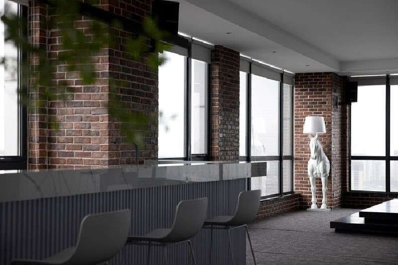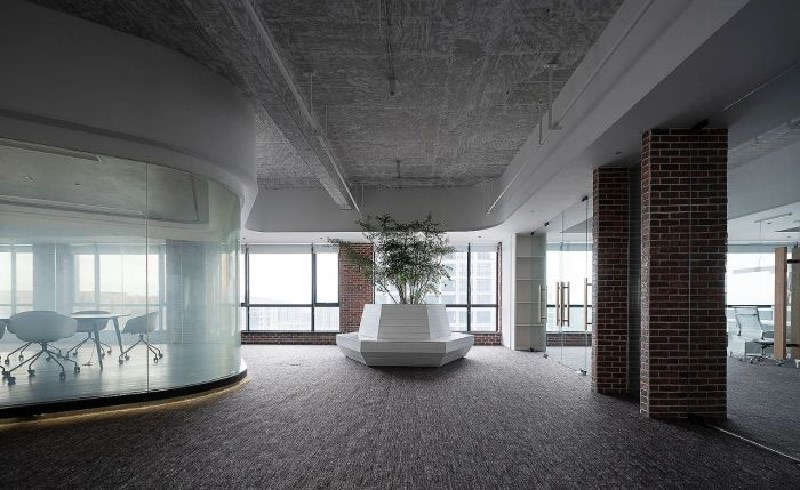 經(jīng)劃分,原本四方的整體空間,大致可歸為公共辦公區(qū)、獨(dú)立辦公室、黨建室、互動區(qū)、財(cái)務(wù)室、會議室、儲藏室、休閑室、檔案室及其他功能區(qū)域。拋去濃烈的墨黑,以灰、白作主色調(diào),既保持了沉穩(wěn)、大氣的理智感,又不使氣氛過于肅靜。前臺加入金色提亮,搭配大理石的紋理質(zhì)感,活波間亦不落俗,凈土之上雅致盡顯。在簡約現(xiàn)代的輕工業(yè)氛圍下,色彩、裝飾往往點(diǎn)到為止。紅磚墻與藤編椅的原生感,質(zhì)樸、不造作,在一片素雅的環(huán)境中,如曇花輕綻,為空間注入悄無聲息的生命力。