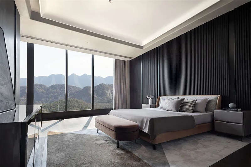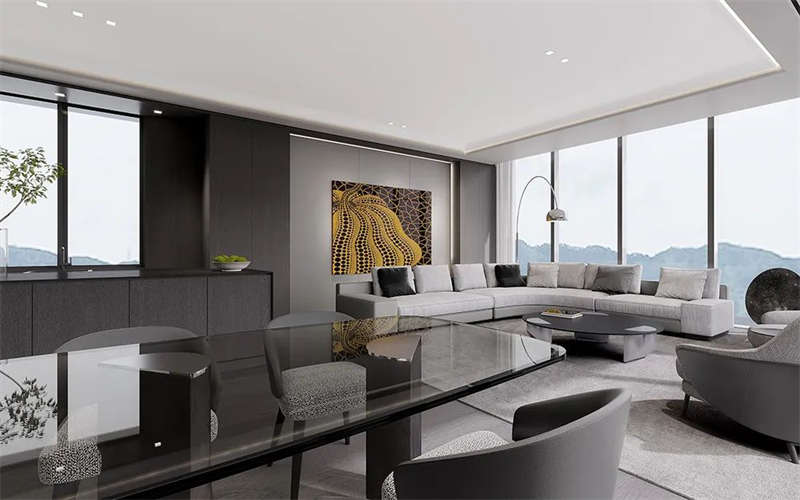 流暢的樓梯設計手法貫穿縱向空間,一氣呵成。黑白雙層欄桿扶手、無縫樹脂地坪和極具設計感的線性燈帶,把這種極致簡約的設計風格伸延到整個空間。