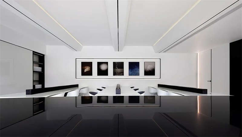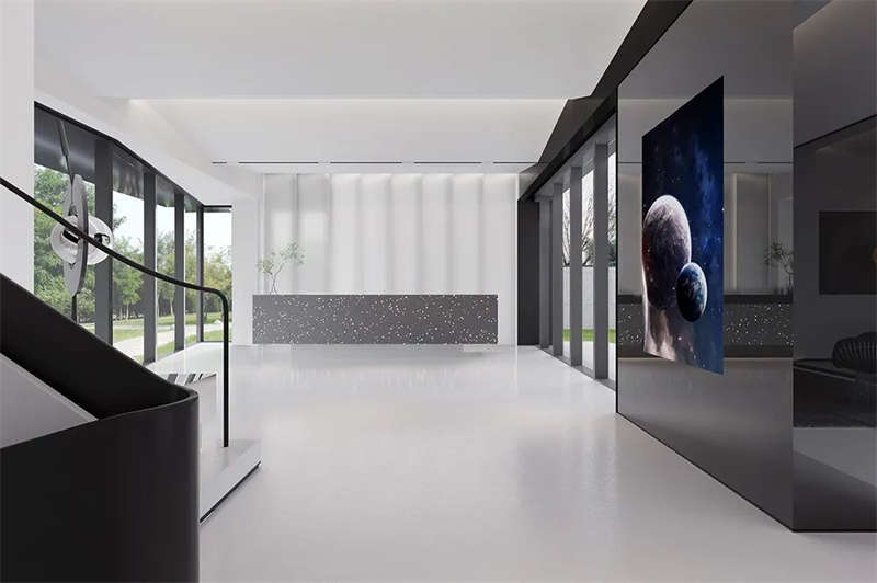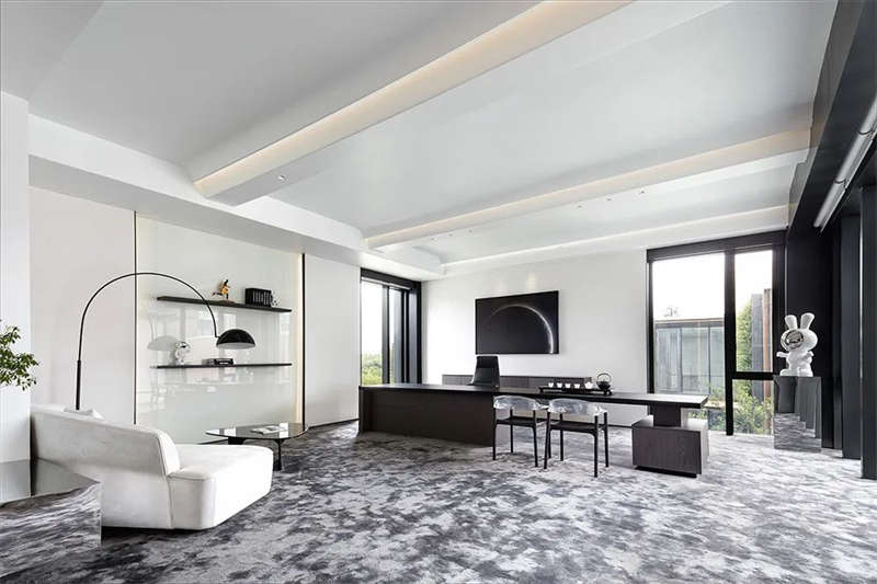 一層前臺,以黑白創(chuàng)作出一個極致簡潔的空間,兩側落地開窗實現(xiàn)無限延伸,空間的邊界更加柔軟,內(nèi)庭院成為接待區(qū)的裝飾景觀,前臺及背景以“帆”這一意象表達對于宇宙世界探索的起航。樹脂地坪的無接縫特性解決了材質(zhì)拼接的繁瑣,讓空間更加純粹簡潔。