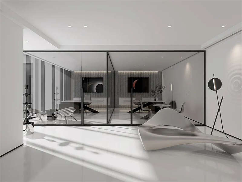 接待區(qū)以沙發(fā)組和會議室實現(xiàn)休息、接待、和會議功能。沙發(fā)地毯圍合成舒適的功能區(qū),落地燈、藝術裝置讓這里更有會客廳的親切感,灰色與白色的搭配經(jīng)典時尚。
