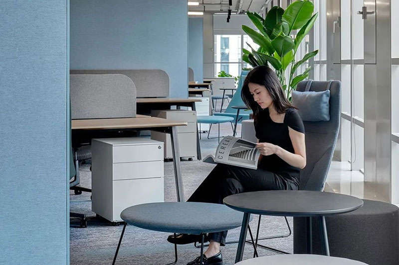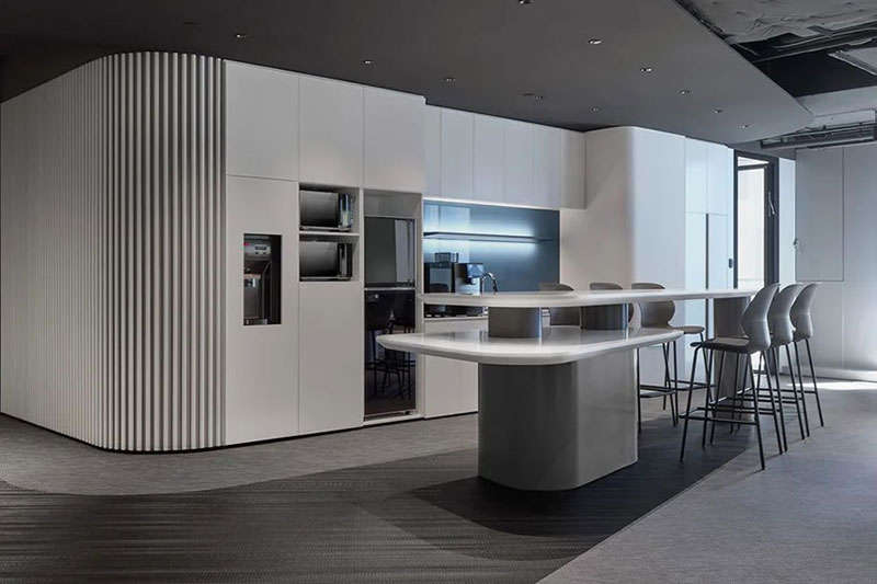 由于建筑不是專業(yè)寫(xiě)字樓,全開(kāi)放的租賃面積、過(guò)大的柱體、凌亂的工業(yè)管道天花也給設(shè)計(jì)提出了難題。為了平衡好行政辦公和會(huì)客及不同部門(mén)之間的功能分區(qū),設(shè)計(jì)師把打印、咖啡、小洽談休憩空間作為功能島置入整層的正中,合理分隔東西兩個(gè)工區(qū)并方便大家便捷使用。沿窗的柱體通過(guò)裝飾面的包裹和扭轉(zhuǎn)形成空間亮點(diǎn),輔以休閑家具,簡(jiǎn)短的洽談分享、小的會(huì)議討論在此得以解決,員工在介于室內(nèi)空間和自然窗光中獲得了獨(dú)特的體驗(yàn)和助益。
