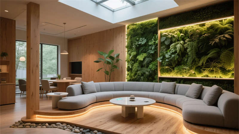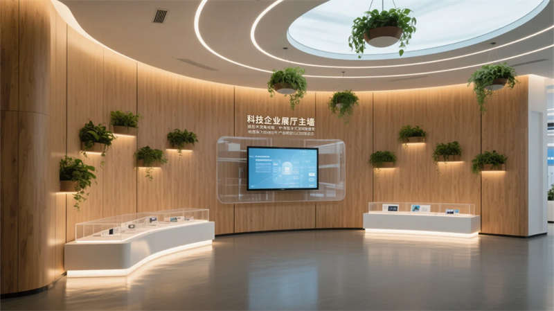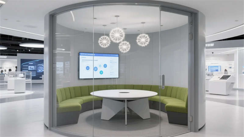 入口以光帶引導(dǎo)與生態(tài)綠墻開(kāi)啟敘事,核心展區(qū)通過(guò)懸浮觸控與嵌入式展臺(tái)聚焦技術(shù)創(chuàng)新。數(shù)字沙盤(pán)區(qū)突破物理限制,以天地屏聯(lián)動(dòng)呈現(xiàn)發(fā)展藍(lán)圖;智能會(huì)議艙可隨時(shí)轉(zhuǎn)化為協(xié)作中樞,通透隔斷維持空間對(duì)話(huà)性。文化長(zhǎng)廊以光影步道承載企業(yè)精神,生態(tài)休憩區(qū)則借自然光影與苔蘚景觀(guān)構(gòu)建減壓綠洲。